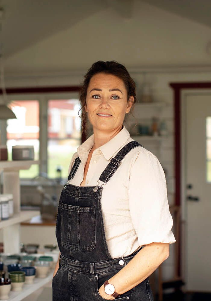 Jag har hållit på med stengodskeramik i snart 20 år, mestadels drejat men även kavlat, ringlat och skulpterat. Jag har drivit gårdsbutik där jag sålt mitt bruksgods och jag har fått mycket positiv respons från mina kunder. De verkar ha uppskattat mitt kreativa uttryck, mitt enkla skandinaviska formspråk men framför allt kvalitén som handgjorda stengodsföremål ger. Man ska kunna använda grejorna varje dag i många, många år. Fullärd blir man dock aldrig, varje dag lär jag mig nåt nytt. Lera att är ett levande material, alla lertyper är olika, glasyrer beter sig olika beroende på vilken lera man glaserar. Keramik är ett hantverk i alla moment, från bearbetning, drejning och beskickning till bränning och slutligen glasering. Jag drejar numera mot beställning i mån av tid. Skicka mail om du är intresserad. karin@glim.se